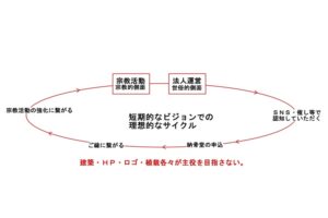 納骨堂の建築はお寺にとって、新しい檀家さんとしてのつながりが出来ることと法事以外でお寺に足を運んでいただく良い機会になります。さらに納骨檀の申し込みでの収入にもつながります。ただ、納骨堂にはかなりな建築費がかかりますので、まずは数年後の新納骨堂建築を目的とした短期的な試みがあっても良いと考えています。具体的なことはここでは書きませんが、方法はあると思います。そしてその納骨堂を手掛かりにお寺の認知と納骨檀の申し込みを増やして行きたいと思います。その為にもSNSやホームページの充実・イベントや教室など広い境内と広い座敷などを有効活用した催しを考えていき、少しづつですがお寺とのご縁を増やして行くことが認知にも納骨堂の申し込みにもつながるはずです。そのためのノウハウをご案内しながら長いお付き合いをさせて頂きたいと思っています。図で示したものは短期的なビジョンでの理想的なサイクルです。もしかすると住職の中には利益を生むことは宗教活動として良いことではないとお考えの方も見えると思いますが、お寺は宗教活動ともうひとつ法人運営をしなくてはなりません。その法人運営の原資となることを考えるのは当然であり、将来的には檀家さんの為になります。(お寺がなくなって一番大変なのは檀家さんです)その為にもこの理想のサイクルをお寺と一緒に目指していきたいと思います。