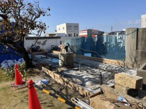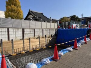 こちらは納骨堂の基礎部分です。今回道路面より1階の床が低いので現状地盤を約1.5m掘っています。